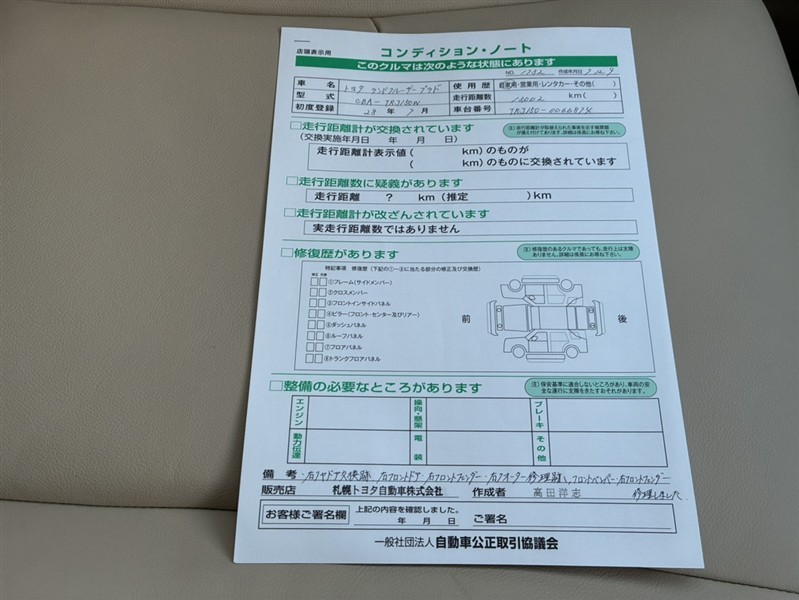 表示項目・方法・運用体制等について、自動車公正取引協議会の定める基準を満たした「トヨタU-Car品質評価制度」に基づき作成しております。