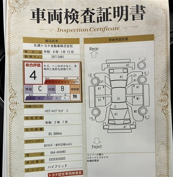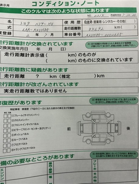 詳細及び現状の車両状態につきましては、店舗スタッフまでお尋ねください。 - 注2)上記と同様の評価点・状態表を「車両検査証明書」として店舗の展示車両に搭載しております。