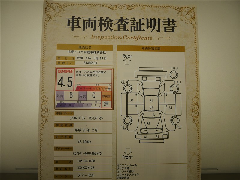 総合評価 4.5 キズ、へこみがほぼ無く、きれいな状態です。(走行距離10万キロ以内で、きれいな状態です。) 評価結果