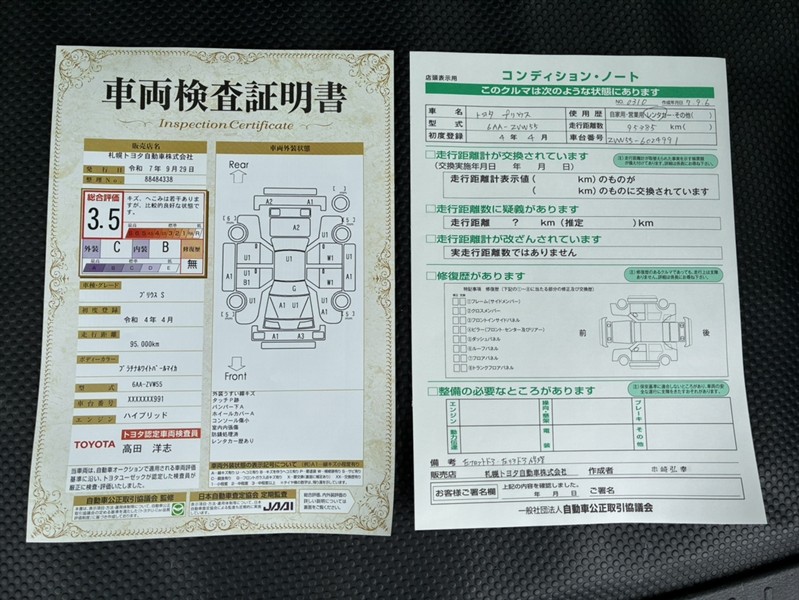 詳細及び現状の車両状態につきましては、店舗スタッフまでお尋ねください。 - 注2)上記と同様の評価点・状態表を「車両検査証明書」として店舗の展示車両に搭載しております。