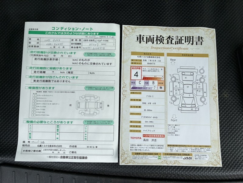 詳細及び現状の車両状態につきましては、店舗スタッフまでお尋ねください。 - 注2)上記と同様の評価点・状態表を「車両検査証明書」として店舗の展示車両に搭載しております。