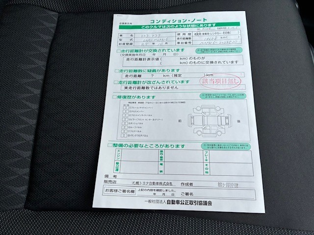 詳細及び現状の車両状態につきましては、店舗スタッフまでお尋ねください。 - 注2)上記と同様の評価点・状態表を「車両検査証明書」として店舗の展示車両に搭載しております。