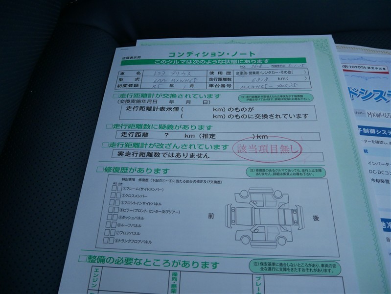 • 「定期点検整備なし(要整備箇所あり)」の場合、整備箇所につきましては、販売店へお問合せください。
