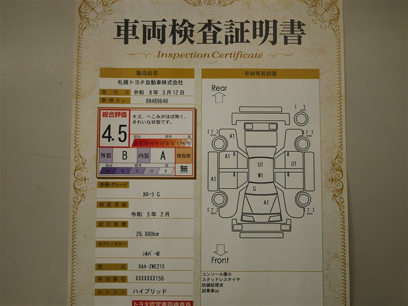 詳細及び現状の車両状態につきましては、店舗スタッフまでお尋ねください。 - 注2)上記と同様の評価点・状態表を「車両検査証明書」として店舗の展示車両に搭載しております。