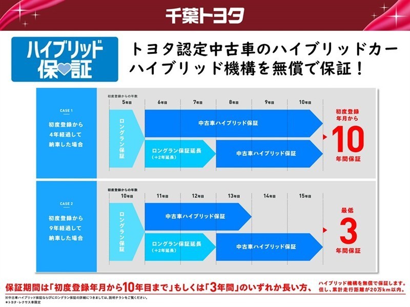 保証内容※1 保証付:ロングラン保証1年<走行距離無制限> +ハイブリッド保証<保証期間は初度登録年月から10年目まで、もしくは3年間のいずれか長い方。但し走行距離20万キロまで>