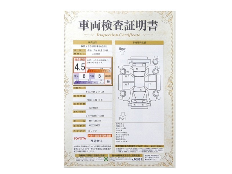 詳細及び現状の車両状態につきましては、店舗スタッフまでお尋ねください。 - 注2)上記と同様の評価点・状態表を「車両検査証明書」として店舗の展示車両に搭載しております。