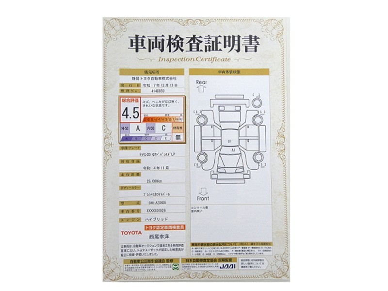 詳細及び現状の車両状態につきましては、店舗スタッフまでお尋ねください。 - 注2)上記と同様の評価点・状態表を「車両検査証明書」として店舗の展示車両に搭載しております。