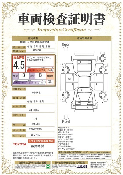 • 注1)本ページに掲載された評価は、車両検査実施時の車両状態を示したものです。