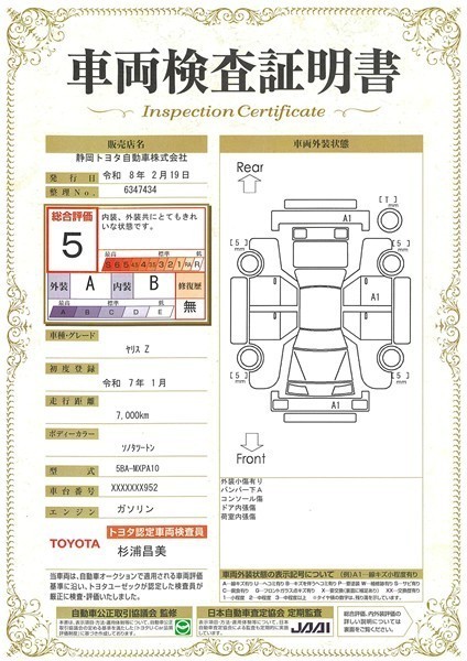 - 表示項目・方法・運用体制等について、自動車公正取引協議会の定める基準を満たした「トヨタU-Car品質評価制度」に基づき作成しております。