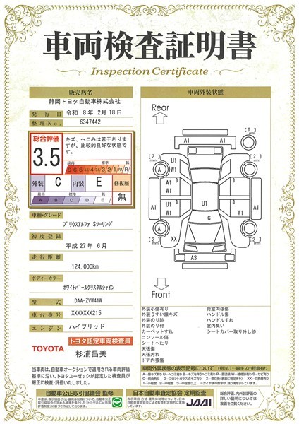 詳細及び現状の車両状態につきましては、店舗スタッフまでお尋ねください。 - 注2)上記と同様の評価点・状態表を「車両検査証明書」として店舗の展示車両に搭載しております。