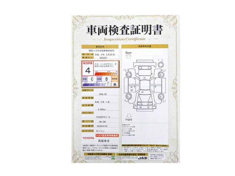 詳細及び現状の車両状態につきましては、店舗スタッフまでお尋ねください。 - 注2)上記と同様の評価点・状態表を「車両検査証明書」として店舗の展示車両に搭載しております。