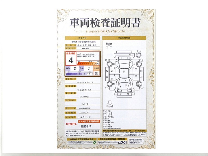 詳細及び現状の車両状態につきましては、店舗スタッフまでお尋ねください。 - 注2)上記と同様の評価点・状態表を「車両検査証明書」として店舗の展示車両に搭載しております。