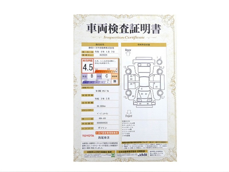 詳細及び現状の車両状態につきましては、店舗スタッフまでお尋ねください。 - 注2)上記と同様の評価点・状態表を「車両検査証明書」として店舗の展示車両に搭載しております。