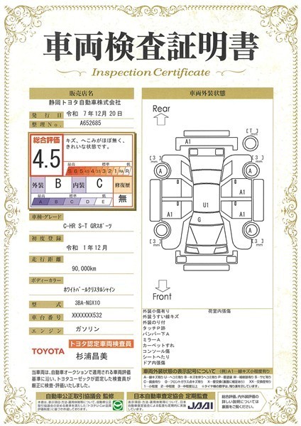 詳細及び現状の車両状態につきましては、店舗スタッフまでお尋ねください。 - 注2)上記と同様の評価点・状態表を「車両検査証明書」として店舗の展示車両に搭載しております。