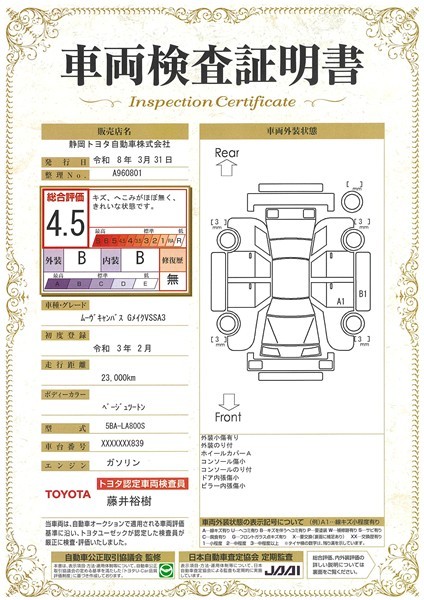 • 注2)上記と同様の評価点・状態表を「車両検査証明書」として店舗の展示車両に搭載しております。