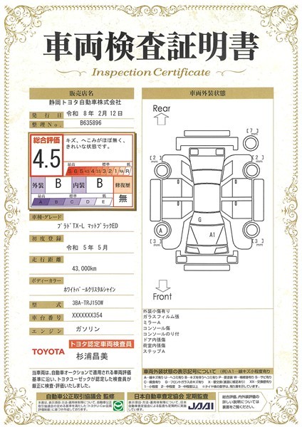 詳細及び現状の車両状態につきましては、店舗スタッフまでお尋ねください。 - 注2)上記と同様の評価点・状態表を「車両検査証明書」として店舗の展示車両に搭載しております。