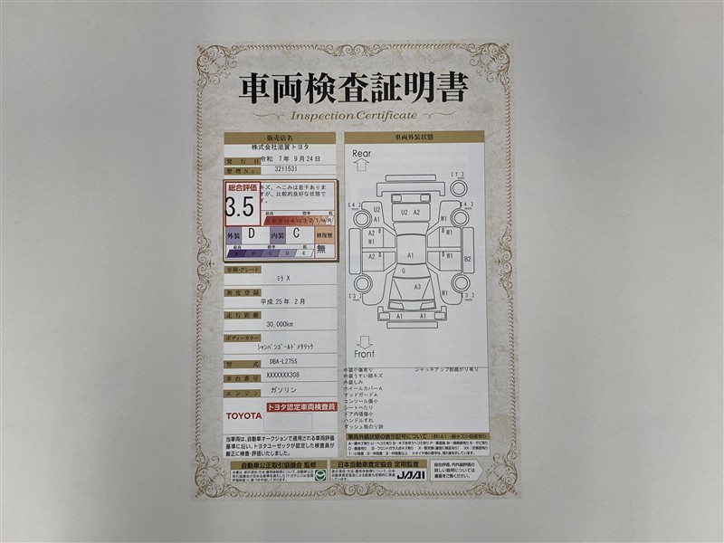 詳細及び現状の車両状態につきましては、店舗スタッフまでお尋ねください。 - 注2)上記と同様の評価点・状態表を「車両検査証明書」として店舗の展示車両に搭載しております。