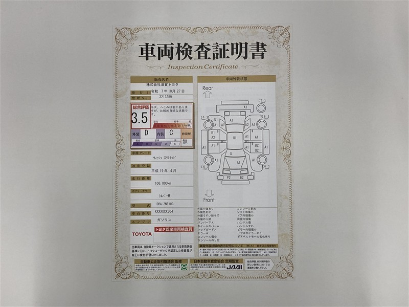 詳細及び現状の車両状態につきましては、店舗スタッフまでお尋ねください。 - 注2)上記と同様の評価点・状態表を「車両検査証明書」として店舗の展示車両に搭載しております。