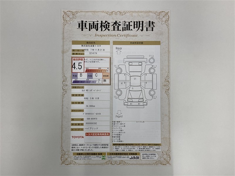 • 注2)上記と同様の評価点・状態表を「車両検査証明書」として店舗の展示車両に搭載しております。