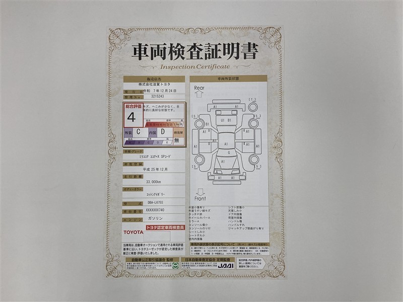 詳細及び現状の車両状態につきましては、店舗スタッフまでお尋ねください。 - 注2)上記と同様の評価点・状態表を「車両検査証明書」として店舗の展示車両に搭載しております。