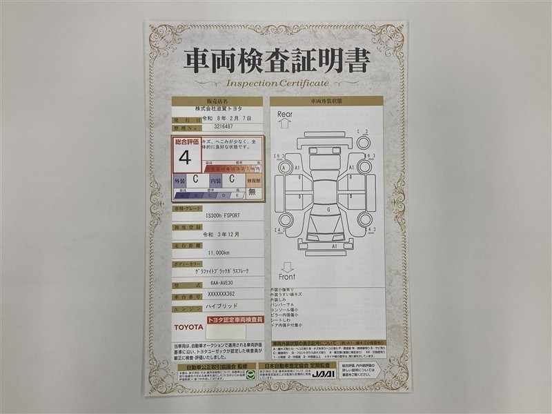 詳細及び現状の車両状態につきましては、店舗スタッフまでお尋ねください。 - 注2)上記と同様の評価点・状態表を「車両検査証明書」として店舗の展示車両に搭載しております。