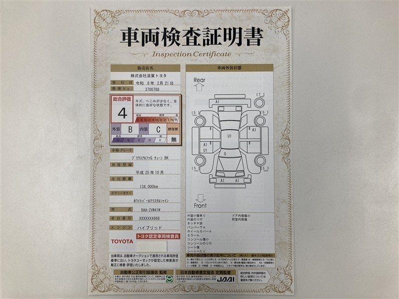 詳細及び現状の車両状態につきましては、店舗スタッフまでお尋ねください。 - 注2)上記と同様の評価点・状態表を「車両検査証明書」として店舗の展示車両に搭載しております。