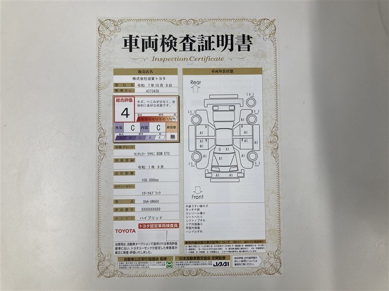 詳細及び現状の車両状態につきましては、店舗スタッフまでお尋ねください。 - 注2)上記と同様の評価点・状態表を「車両検査証明書」として店舗の展示車両に搭載しております。