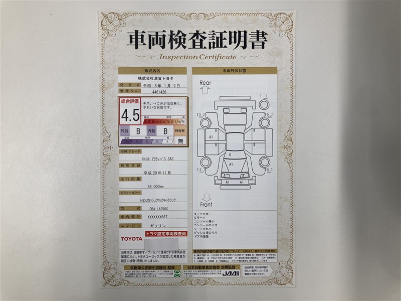 • 注2)上記と同様の評価点・状態表を「車両検査証明書」として店舗の展示車両に搭載しております。