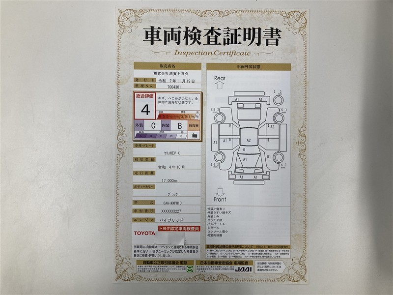 - 表示項目・方法・運用体制等について、自動車公正取引協議会の定める基準を満たした「トヨタU-Car品質評価制度」に基づき作成しております。