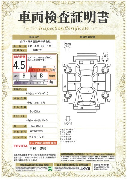 詳細及び現状の車両状態につきましては、店舗スタッフまでお尋ねください。 - 注2)上記と同様の評価点・状態表を「車両検査証明書」として店舗の展示車両に搭載しております。