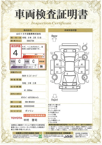 • 注2)上記と同様の評価点・状態表を「車両検査証明書」として店舗の展示車両に搭載しております。