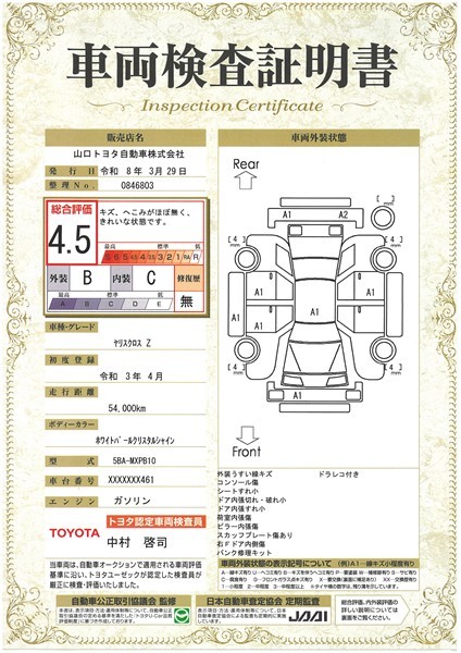 詳細及び現状の車両状態につきましては、店舗スタッフまでお尋ねください。 - 注2)上記と同様の評価点・状態表を「車両検査証明書」として店舗の展示車両に搭載しております。