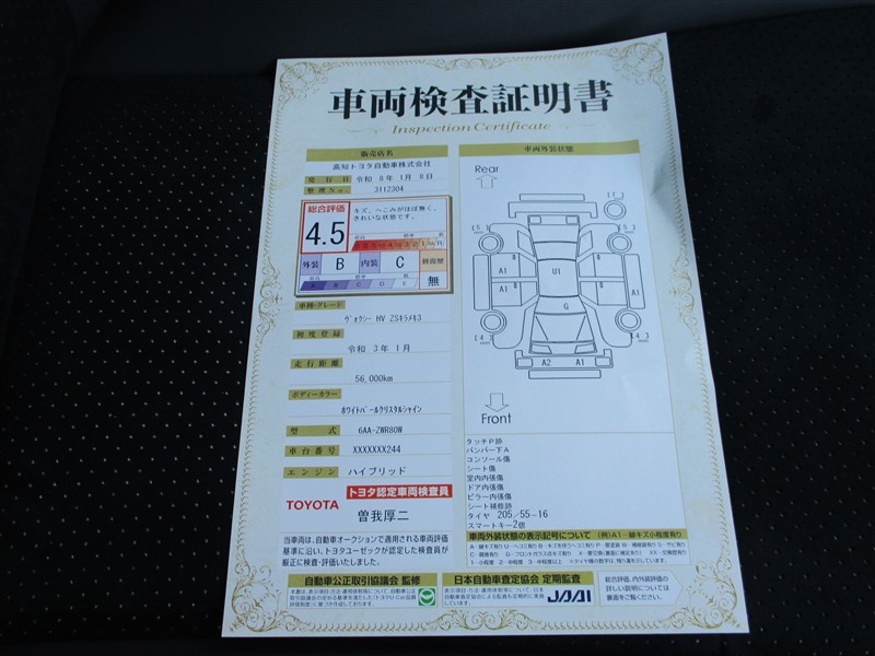 詳細及び現状の車両状態につきましては、店舗スタッフまでお尋ねください。 - 注2)上記と同様の評価点・状態表を「車両検査証明書」として店舗の展示車両に搭載しております。