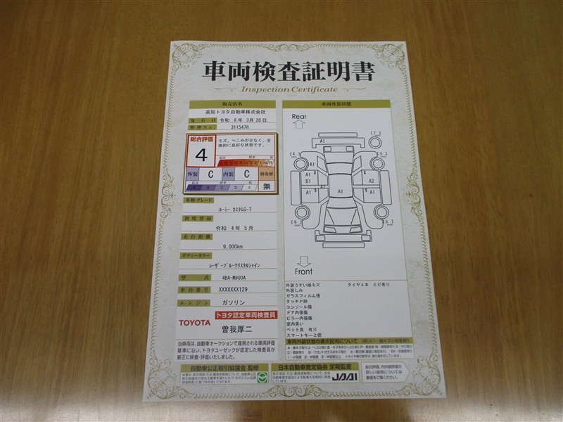 詳細及び現状の車両状態につきましては、店舗スタッフまでお尋ねください。 - 注2)上記と同様の評価点・状態表を「車両検査証明書」として店舗の展示車両に搭載しております。