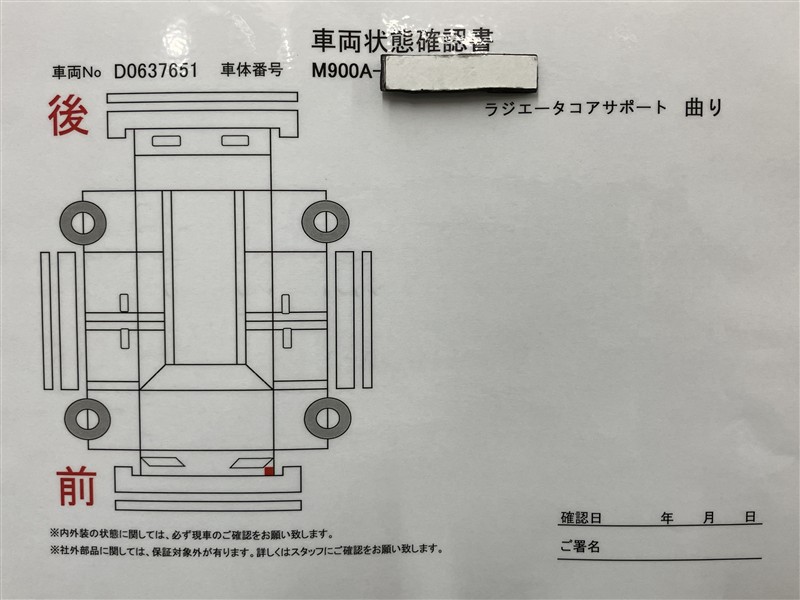 詳細及び現状の車両状態につきましては、店舗スタッフまでお尋ねください。 - 注2)上記と同様の評価点・状態表を「車両検査証明書」として店舗の展示車両に搭載しております。