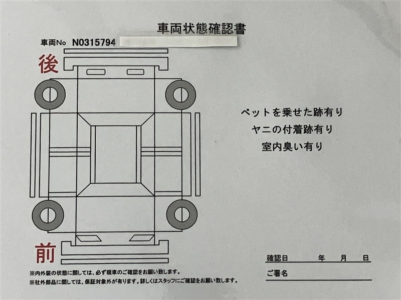- 「定期点検整備なし(要整備箇所あり)」の場合、整備箇所につきましては、販売店へお問合せください。