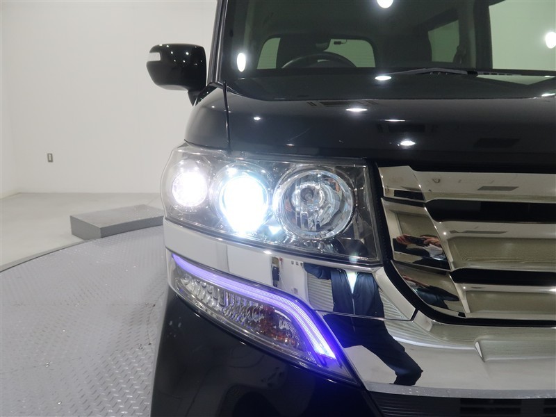 ブラックカラーのN-BOXカスタムGターボLパッケージ・D両側スライドドア・HIDライト・純正アルミ