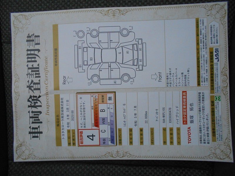 詳細及び現状の車両状態につきましては、店舗スタッフまでお尋ねください。 - 注2)上記と同様の評価点・状態表を「車両検査証明書」として店舗の展示車両に搭載しております。