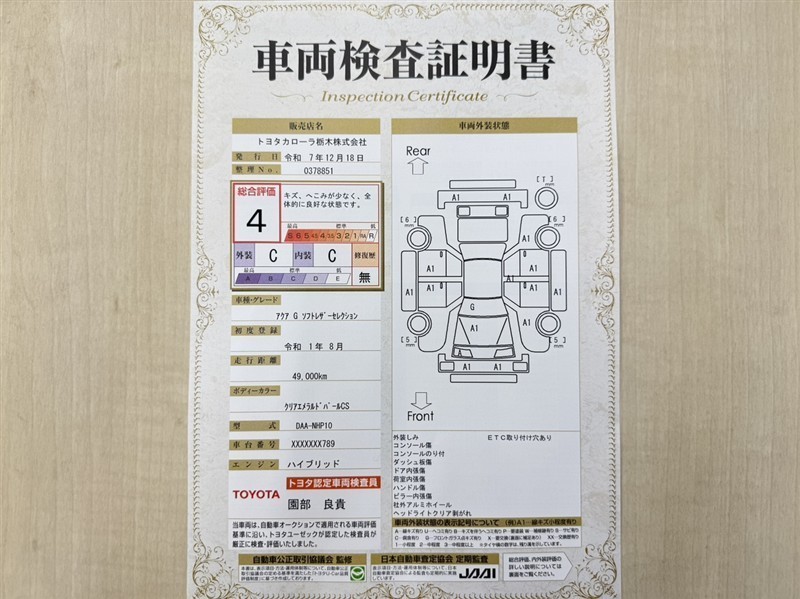 詳細及び現状の車両状態につきましては、店舗スタッフまでお尋ねください。 - 注2)上記と同様の評価点・状態表を「車両検査証明書」として店舗の展示車両に搭載しております。