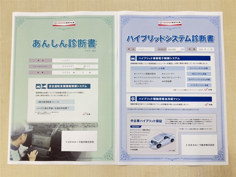 • 注2)上記と同様の評価点・状態表を「車両検査証明書」として店舗の展示車両に搭載しております。