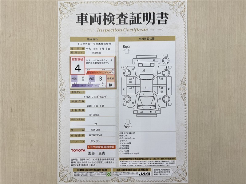 • 注2)上記と同様の評価点・状態表を「車両検査証明書」として店舗の展示車両に搭載しております。