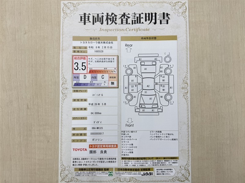 • 注2)上記と同様の評価点・状態表を「車両検査証明書」として店舗の展示車両に搭載しております。
