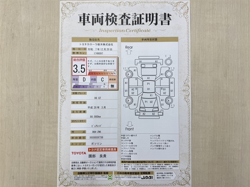 • 注1)本ページに掲載された評価は、車両検査実施時の車両状態を示したものです。