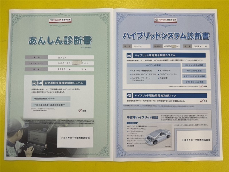 • 注2)上記と同様の評価点・状態表を「車両検査証明書」として店舗の展示車両に搭載しております。