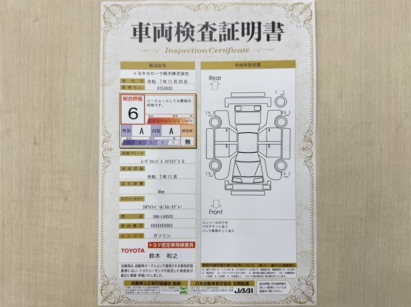 総合評価 6 U-Carとしては最高の状態です。(新車登録後3年未満、走行距離3万キロ以内で、中古車としては最高の状態です。) 評価結果