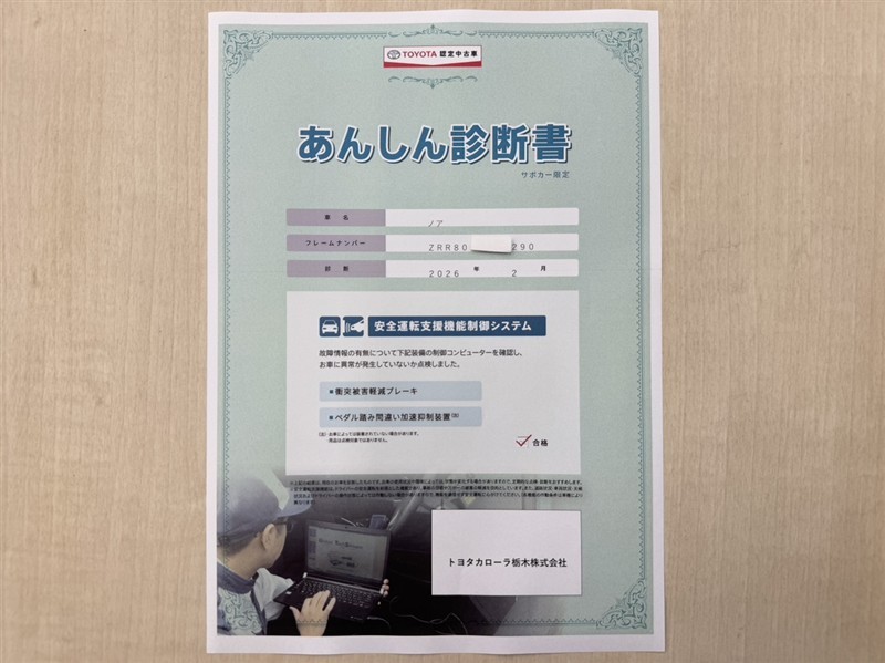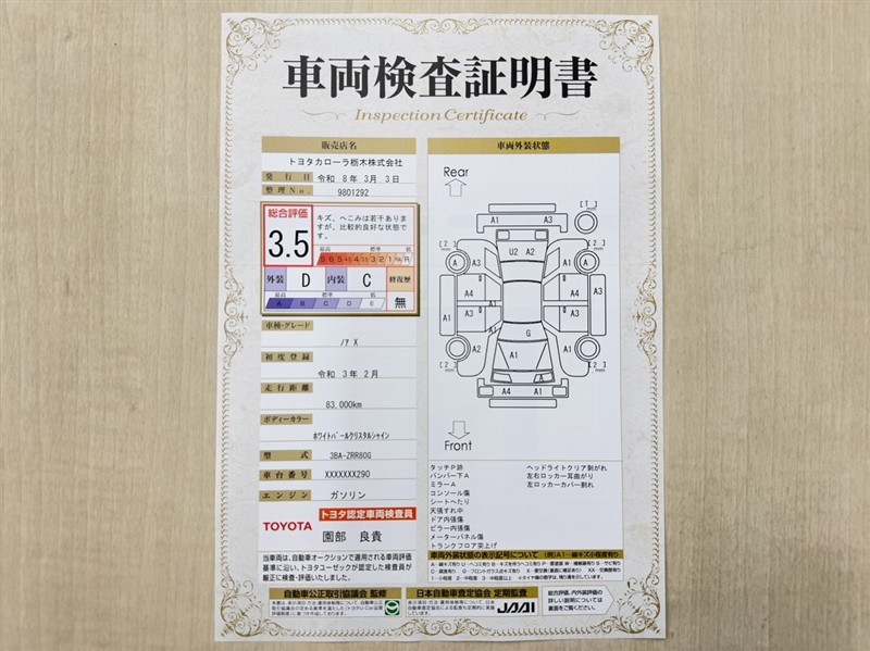 • 注2)上記と同様の評価点・状態表を「車両検査証明書」として店舗の展示車両に搭載しております。