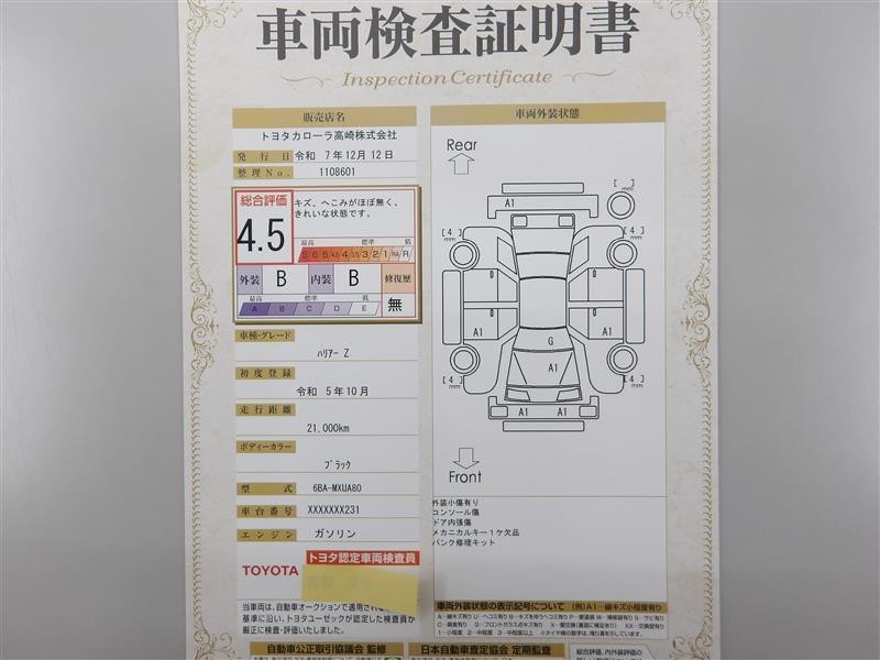 詳細及び現状の車両状態につきましては、店舗スタッフまでお尋ねください。 - 注2)上記と同様の評価点・状態表を「車両検査証明書」として店舗の展示車両に搭載しております。