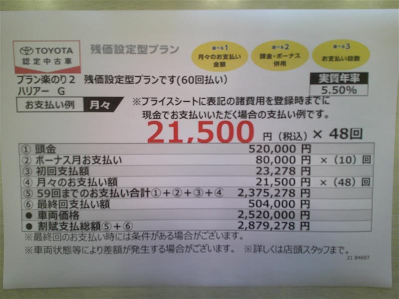 - ・支払回数60回(5年)、実質年率5.5%、頭金500,000円、ボーナス払い75,000円(10回)、割賦元金1,960,000円、初回支払額23,347円、最終回支払額492,000円、割賦支払総額2,811,747円