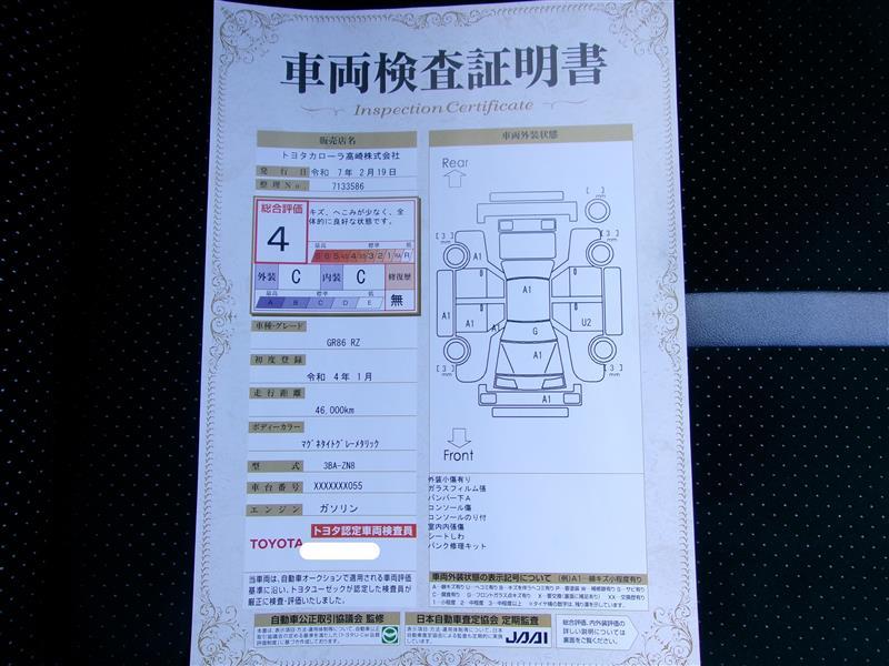 詳細及び現状の車両状態につきましては、店舗スタッフまでお尋ねください。 - 注2)上記と同様の評価点・状態表を「車両検査証明書」として店舗の展示車両に搭載しております。