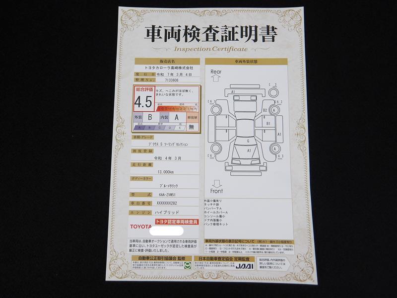 | 保証内容※1 | 保証付:ロングラン保証1年<走行距離無制限> +ハイブリッド保証<保証期間は初度登録年月から10年目まで、もしくは3年間のいずれか長い方。但し走行距離20万キロまで> |